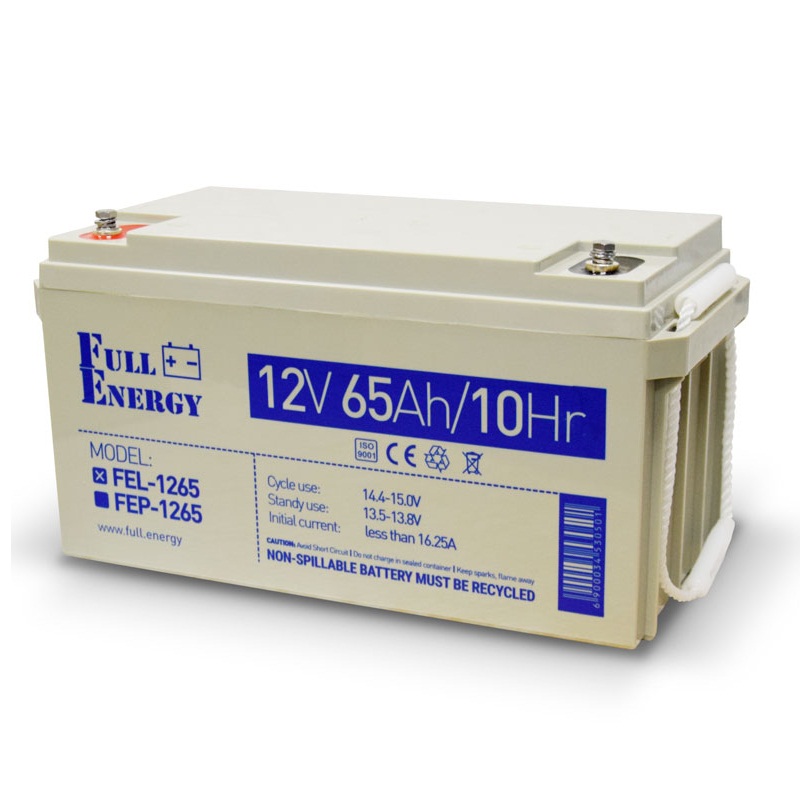 Гелевий акумулятор Full Energy FEL-1265 має ємність 65 Аг та робочу напругу 12V постійного струму. Корпус виконаний з ABS пластику білого кольору. Акумулятор має габаритні розміри – 350x180x167 мм.